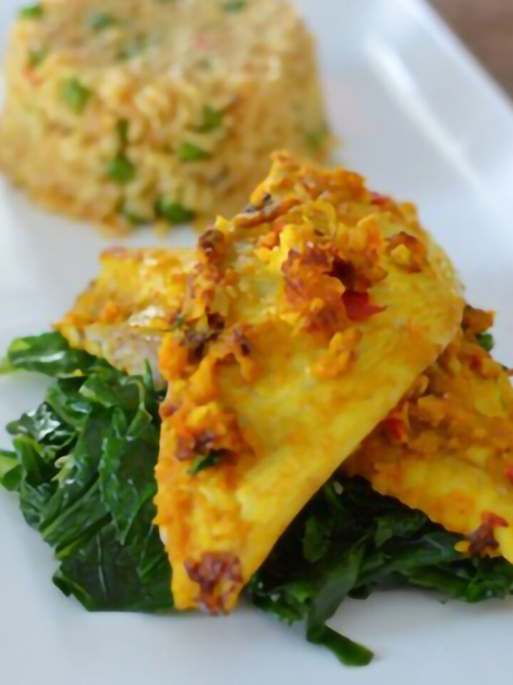 Marinated Fried Tilapia with Tomato and Pea Brown Rice