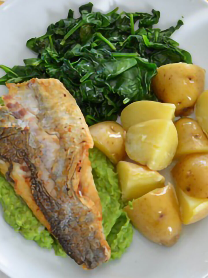 Pan-fried Sea Bass with Creamy Mashed Peas