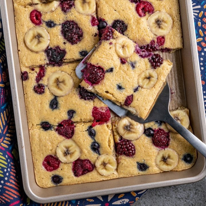 For these Sheet Pan Pancakes I used a mixture of banana and frozen berries which was just the perfect combination.