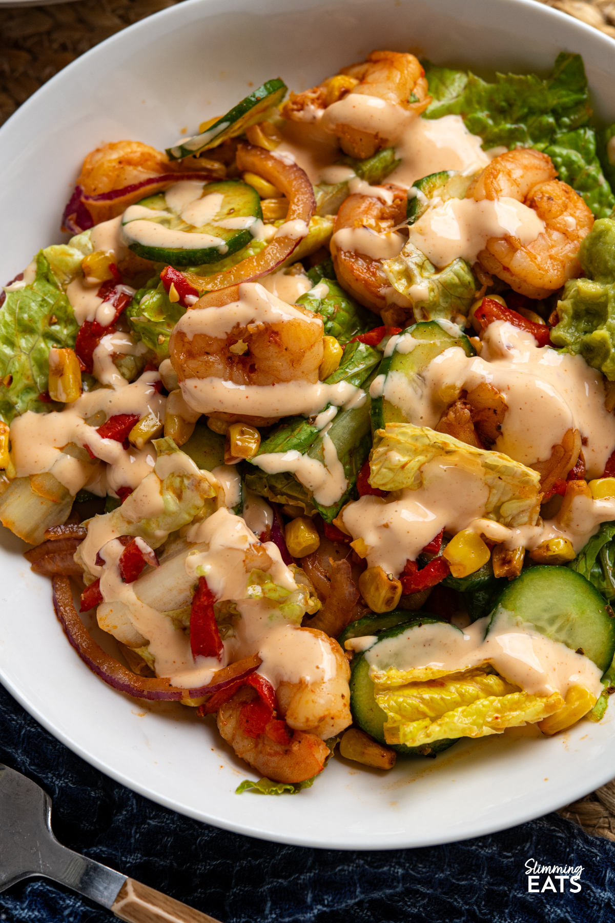 This peri peri king prawn salad is fresh and light, but still packs in loads of flavour. Juicy king prawns coated in peri peri seasoning pair perfectly with crisp romaine, sweet corn, roasted red peppers and crunchy cucumber for a salad that is anything but boring.