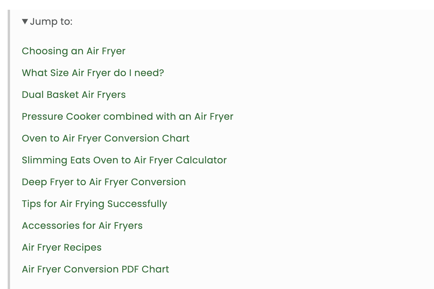 Secondly is the Advance Jump to section at the top of posts. This is gradually being added to posts and it will allow you to jump to a particular section of a post. For example here it is a screenshot of how it appears on my Air Fryer Conversion Post.